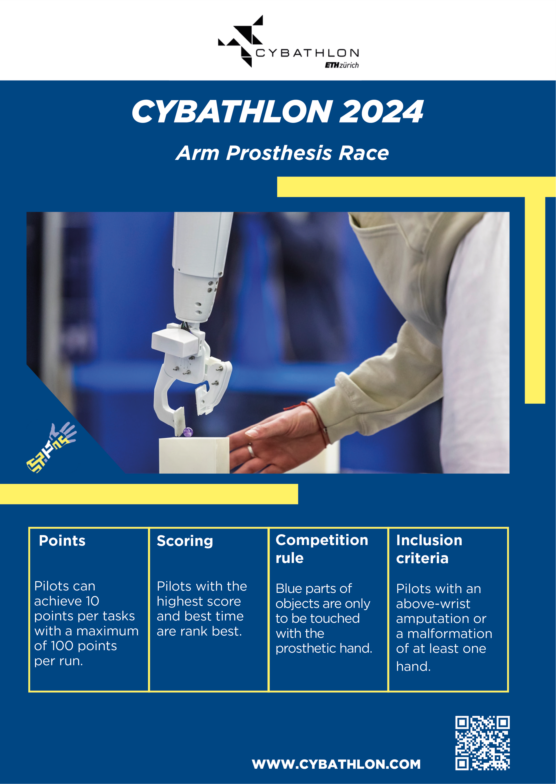 Ik heb de eer om voor de derde keer op rij deel te nemen aan de Cybathlon 2024 in Zürich. Dit keer zal ik niet met mijn eigen prothese (I-Limb) meedoen, maar met een hand die ontworpen zal worden door studenten. Het belooft een grote uitdaging te worden, gezien de taken die ik moet uitvoeren tijdens de Cybathlon.