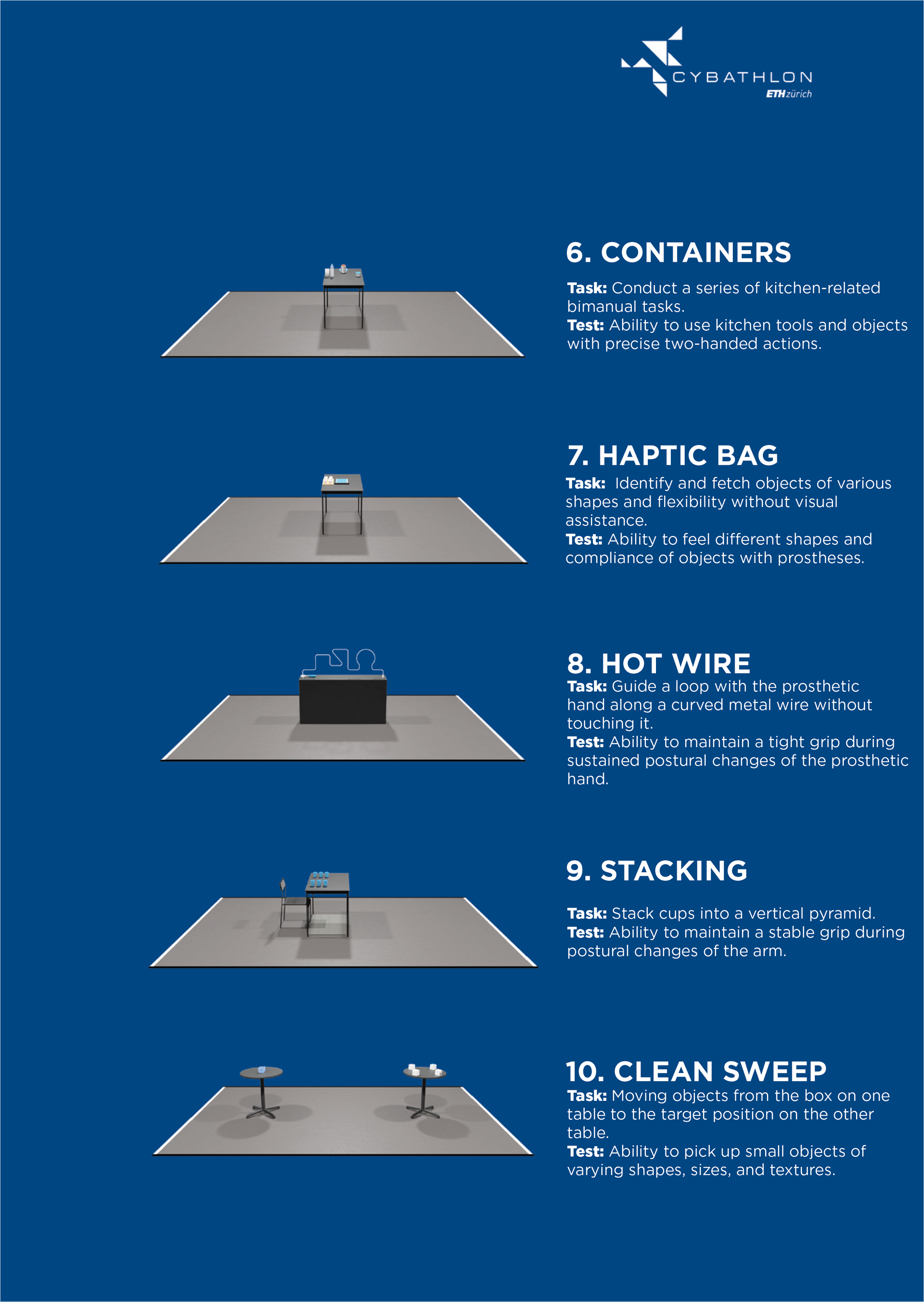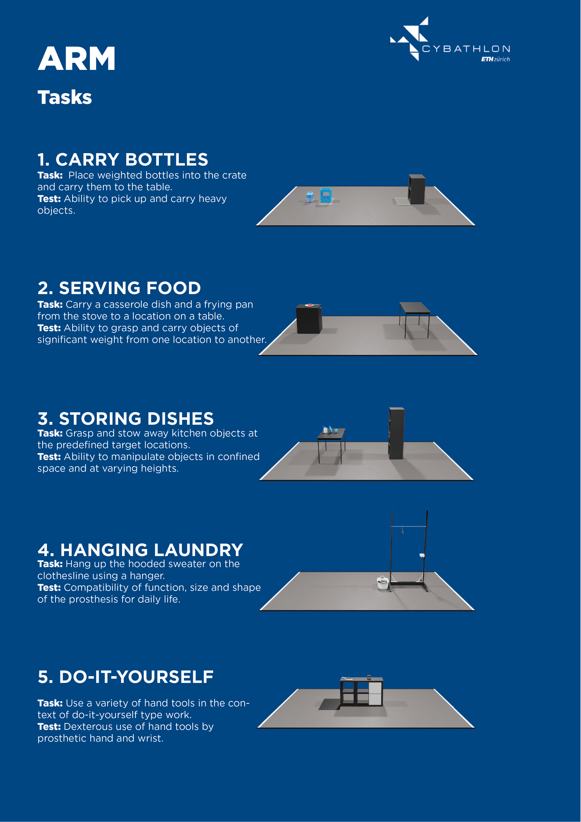 De competitietaken testen verschillende vaardigheden, zoals sensorische feedback van de hand, het vermogen om de handpalm omhoog en omlaag te draaien, of het vermogen om met objecten van verschillende groottes, vormen en gewichten om te gaan, evenals de coördinatie van beide handen. Over het algemeen bevatten de taken meer variabiliteit en onzekerheid over de exacte structuur of over de exacte rangschikking van de verschillende objecten in vergelijking met de competities in 2016 en 2020.